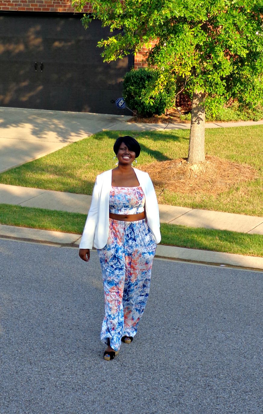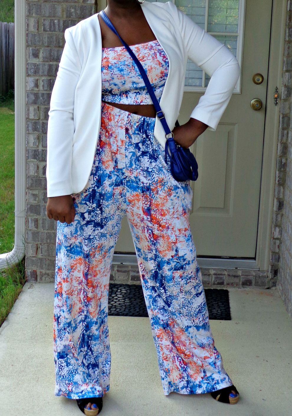 This outfit is so cute! I love the 2-piece outfit, the white blazer and the crossbody bag. The wedges look comfortable as well. You better werk!