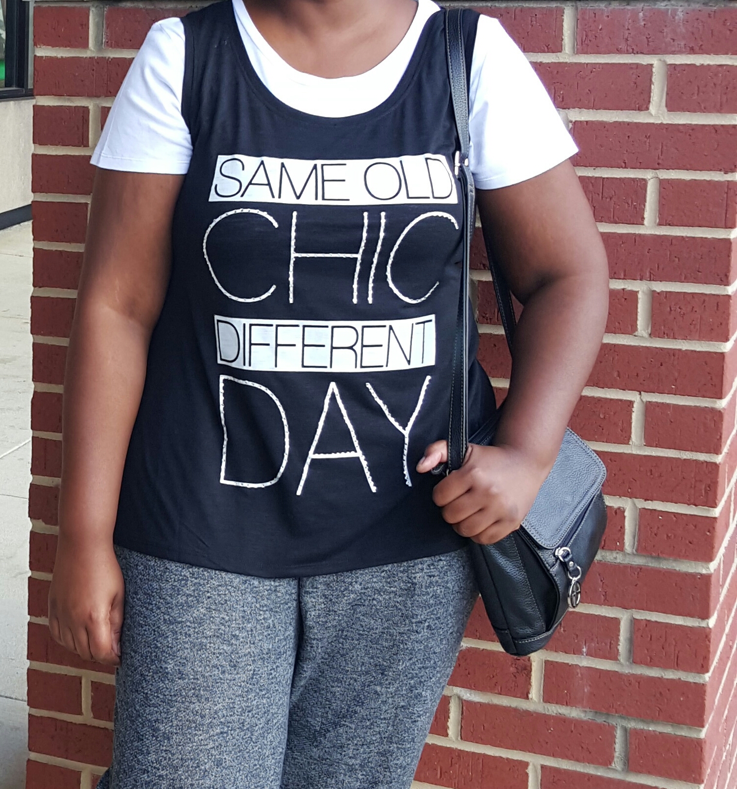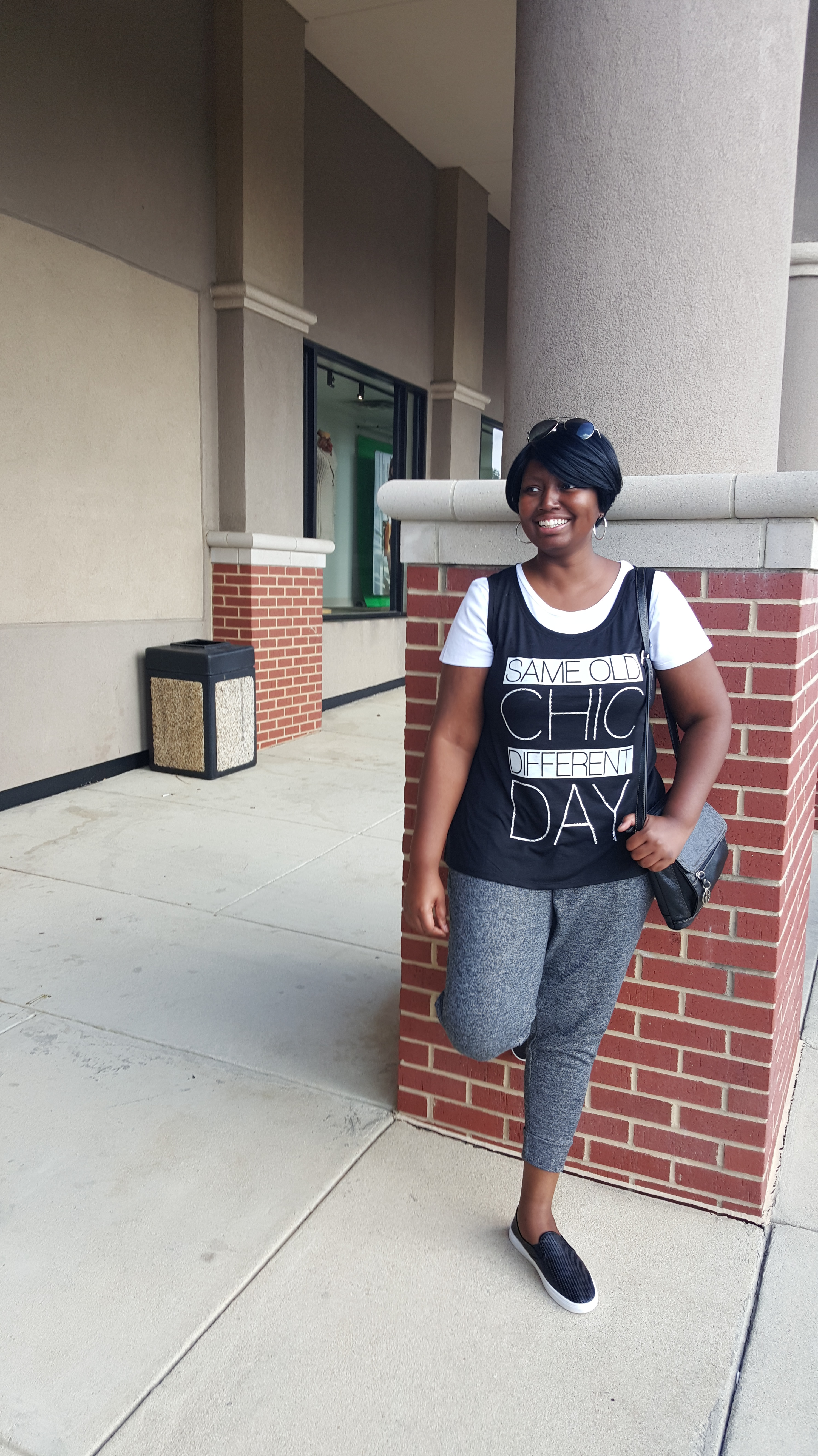 If you know me, you know that it is rare that I dress down. But since I was running a few quick errands today, I decided to go for a really relaxed look. After spying this “Same Old Chic Different Day” graphic tee in Macy’s and copping it for under $6.00, I had to find a reason to wear it. So I paired it with some comfy joggers I purchased last Fall from Ashley Stewart and perforated slip-ons i scored for $10 at Payless. By the way, I love these shoes! They are some of the most comfortable shoes ever and not to mention stylish and on trend. Check out my look below.